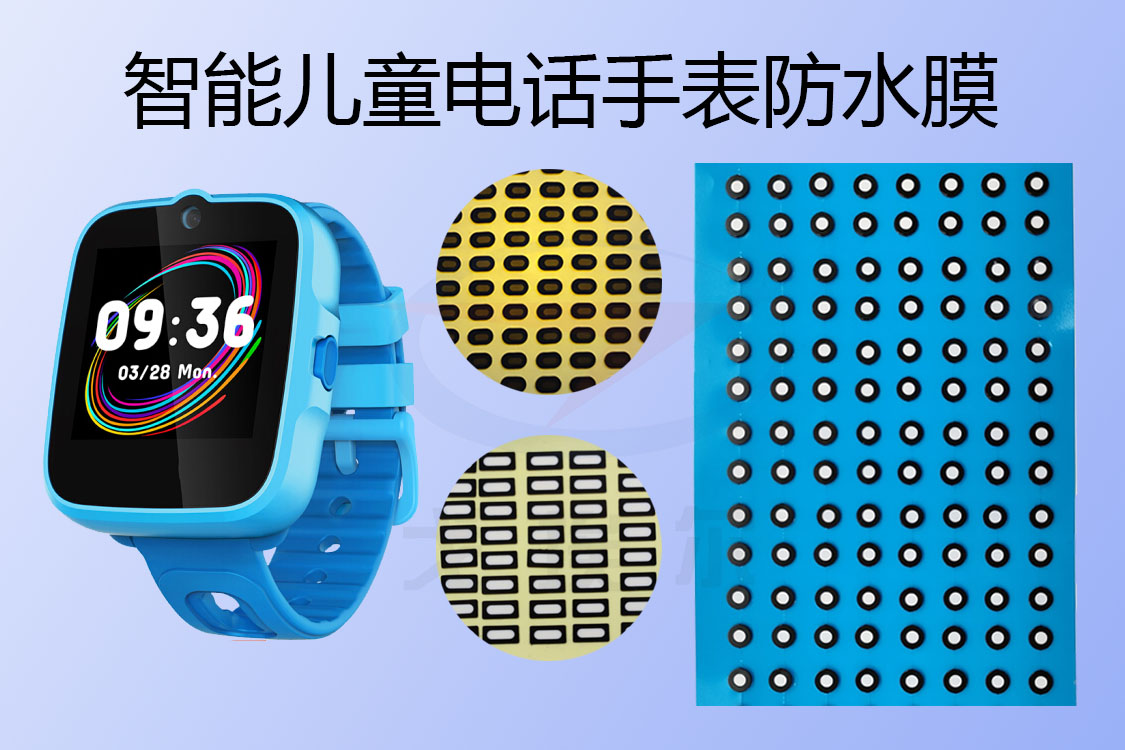 智能兒童電話手表防水膜通過高性能背膠粘附在智能手表密封殼體的相應(yīng)的透聲孔或者透氣孔處,通過智能兒童電話手表防水膜可以保護(hù)敏感揚(yáng)聲器、麥克風(fēng)和受話器不受水、灰塵、污垢和其它雜質(zhì)影響,同時