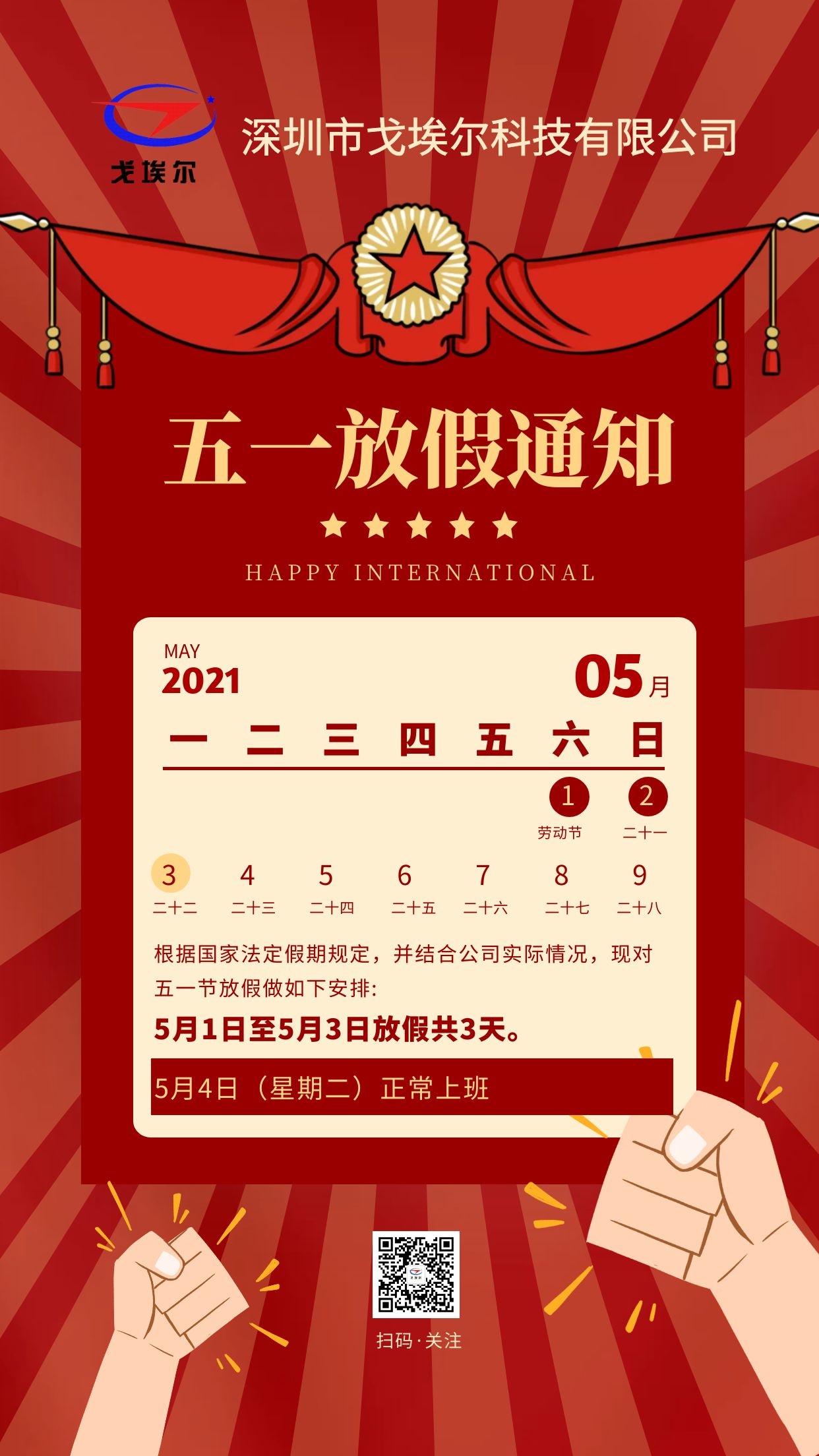 根據國務院《關于2021年節假日安排的通知》相關規定,并結合戈埃爾科技的實際情況,現將2021年五一節勞動節放假具體安排如下: